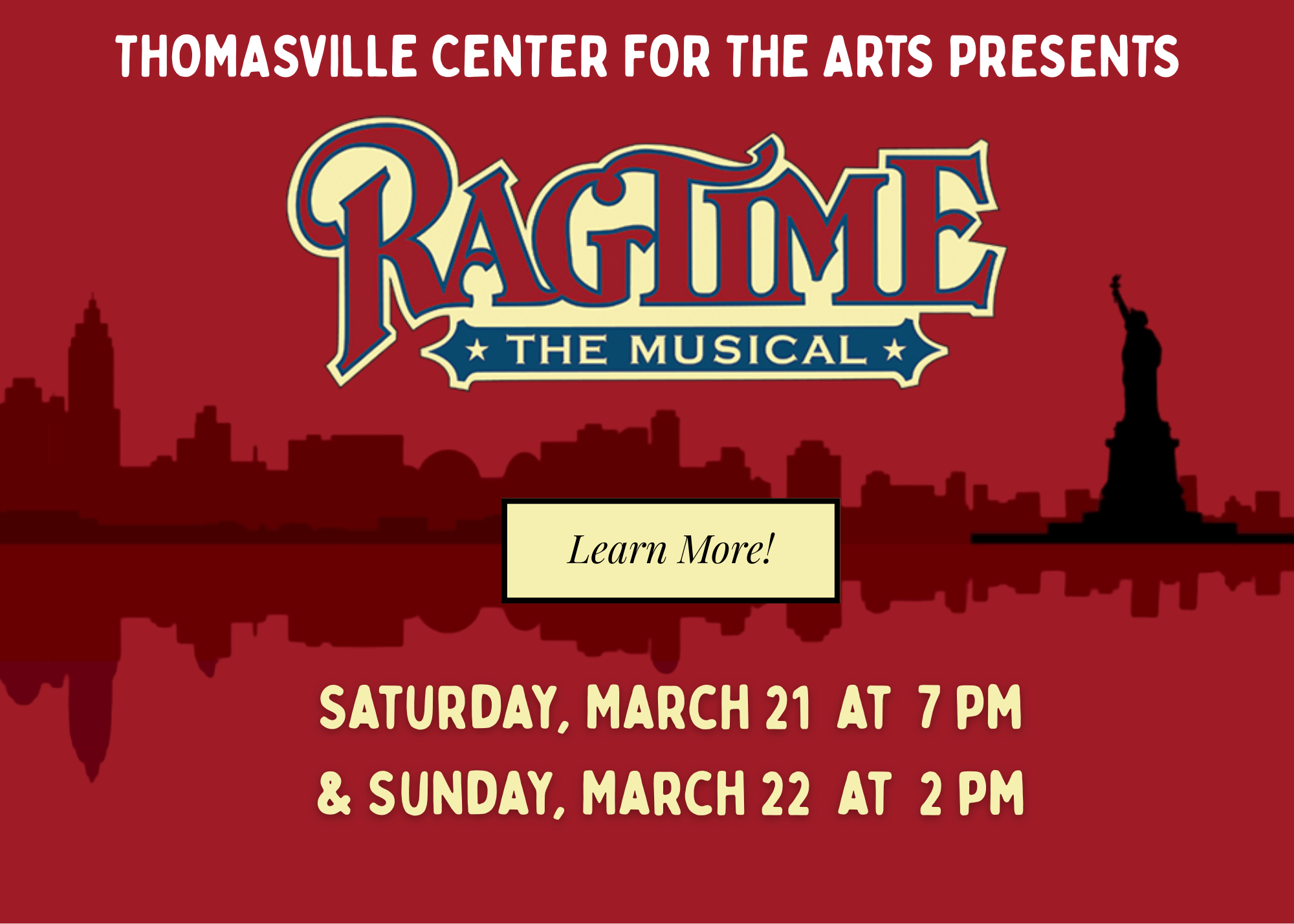 A community musical directed by Hananel Mavity Jackson and produced by Thomasville Center for the Arts.Book by Terrence McNallyMusic by Stephen FlahertyLyrics by Lynn AhrensBased on the novel Ragtime by E.L. DoctorowPresented though special arrangement with Music Theatre International (MTI).Ragtime is a sweeping musical adaptation of EL Doctorow’s novel that follows 3 fictional families in pursuit of the American Dream at the dawn of the 20th Century. Limited seating.Ticket prices: $20/$15 (student, educator, veteran discount)