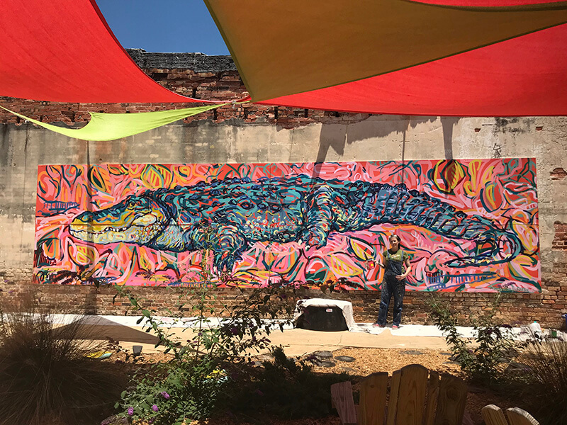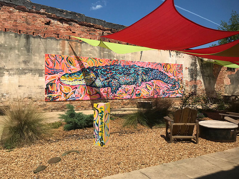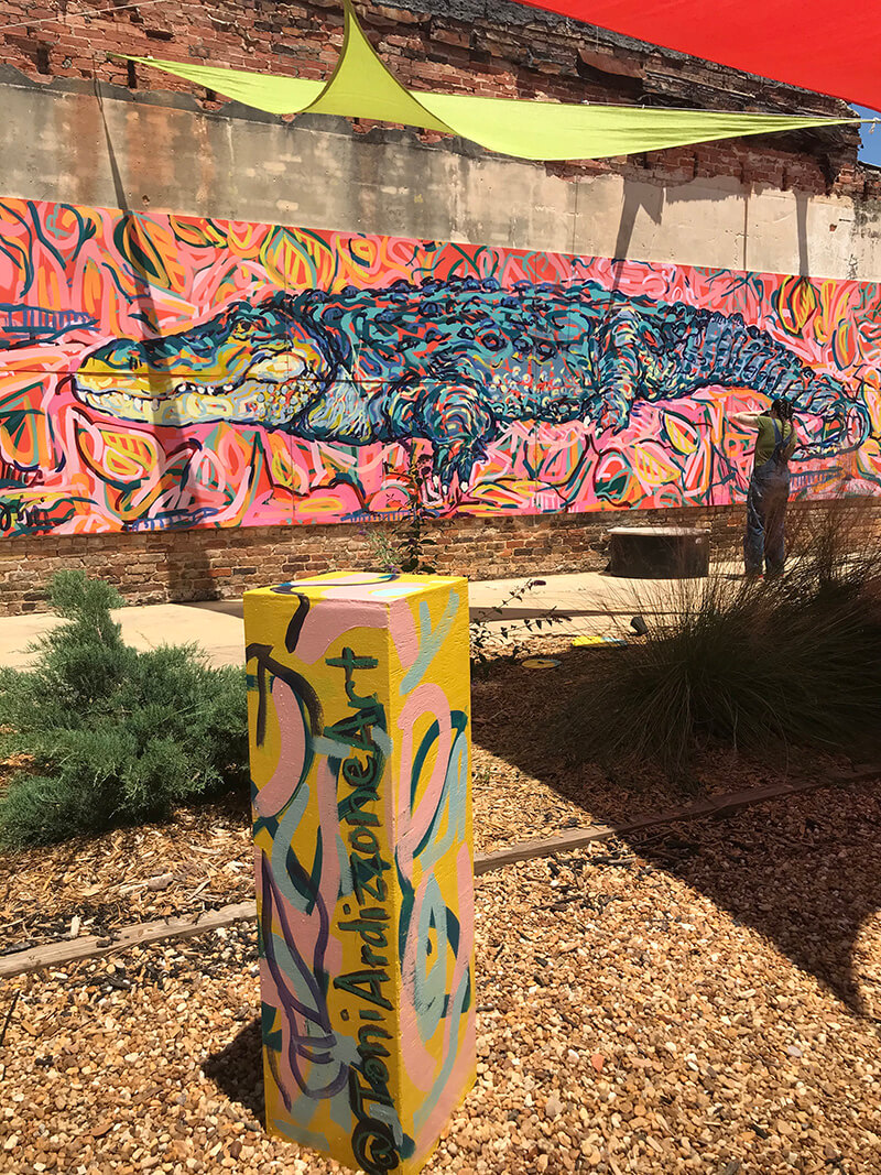Artist, Toni Ardizzone takes you to the swamp with her very exciting homage to a mascot of the South. Dinosaur of the South is a celebratory work engaging the viewer with rhythmic, vibrating color and untamed brushstrokes.  Like the alligator, which as a species has survived for more than 84 million years, the work embodies the resilience and strength needed to survive.  This project, created in this unprecedented era of COVID-19, is also intended to convey the healing power of art.  Presented by Thomasville Center for Arts in partnership with Hurst Boiler, the experience is sure to bring joy, hope, and a sense of place to this community space.