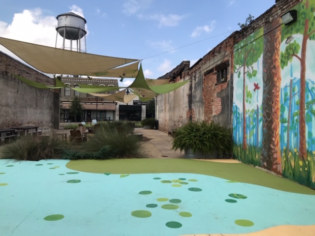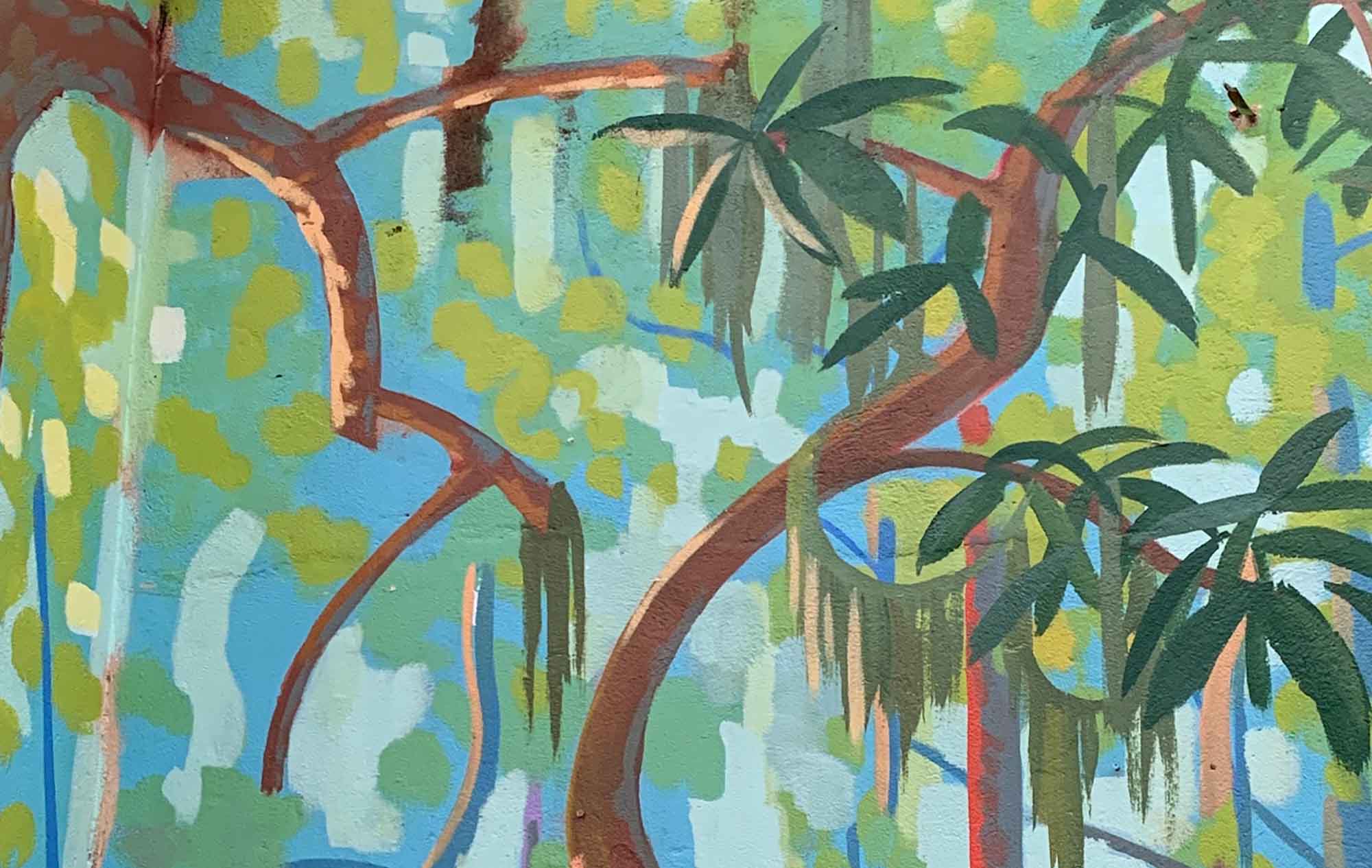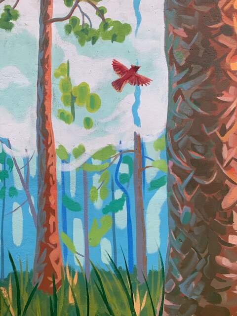 Morning in the Tall Pines draws inspiration from the surrounding forested areas, including the Tall Timbers Research Station, where Joe set the scene for a misty morning in the longleaf pine forest. Using vibrant blues and greens, contrasted by the dark-red brick color of the pine trunks, Joe created a piece that feels dense with vegetation, but also spacious, much like the local forests. Catch this mural just after sunrise, and it really seems as if the light of the early sun is reflecting off of the painted trees while the early morning mist drifts up into the atmosphere.