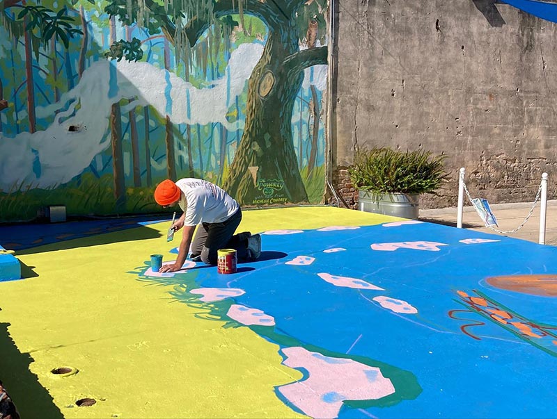 Joe Cowdrey demonstrated techniques and engaged with our community as he painted a ground mural, Morning at the Fresh Spring, depicting a typical stream found in the Red Hills Region. Visitors watched as he incorporated some of the unique features that are abundantly found in our part of the world, and talked about the value that it brings to our environment. Drawing inspiration from the iconic attributes of the Red Hills Region, Joe Cowdrey portrays the fresh and clean water of our region and honors it as a critical resource to conserve. Using vibrant blues and greens, contrasted by the color of the cypress trunks, Cowdrey creates an artwork that is so compelling; it holds your attention and allows you to stop thinking, to let go, and standing there you’re even more aware of the power of water, and what it can do.