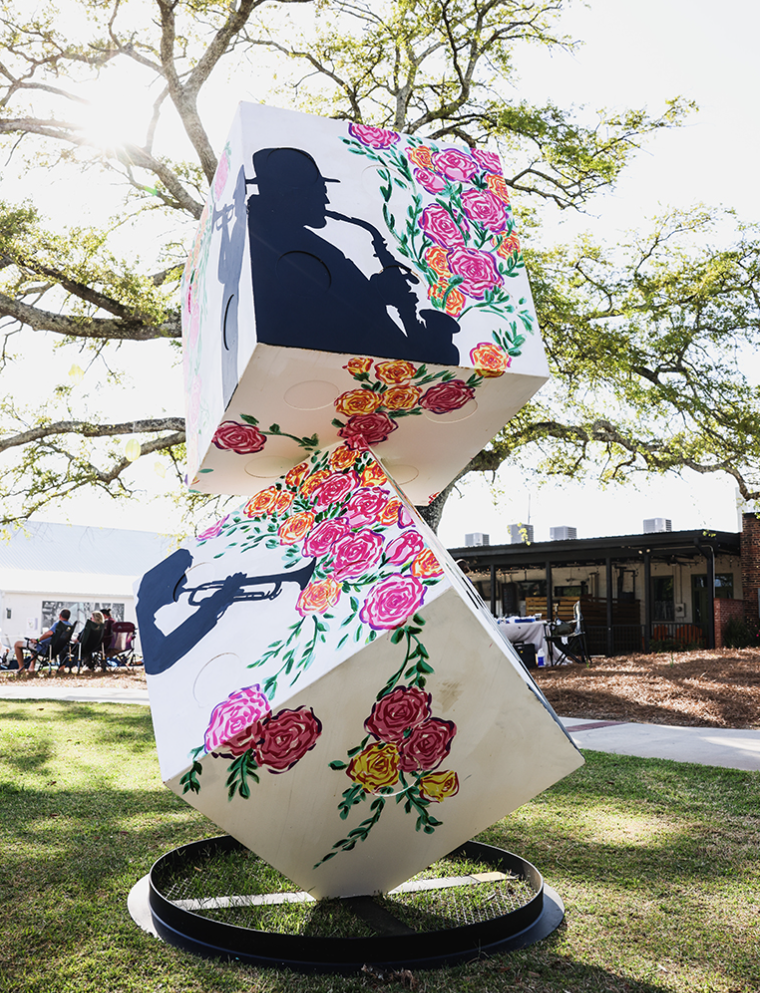 Artist Marlo Ransdell showcases the diversity of wood and acrylic on a sponsor wall filled with color and blooms. Painter Trish Land brings life to the walls and our community with her signature roses. Sam McCoy collaborates with Joe Cowdrey on murals covering the walls and ground, showcasing her interpretation of Southern flora. Cindy Inman captures music and roses through a photo opportunity at the Ritz Amphitheater. Paper mâché artist David Junker brings pollinators to life with various playful sculptures.